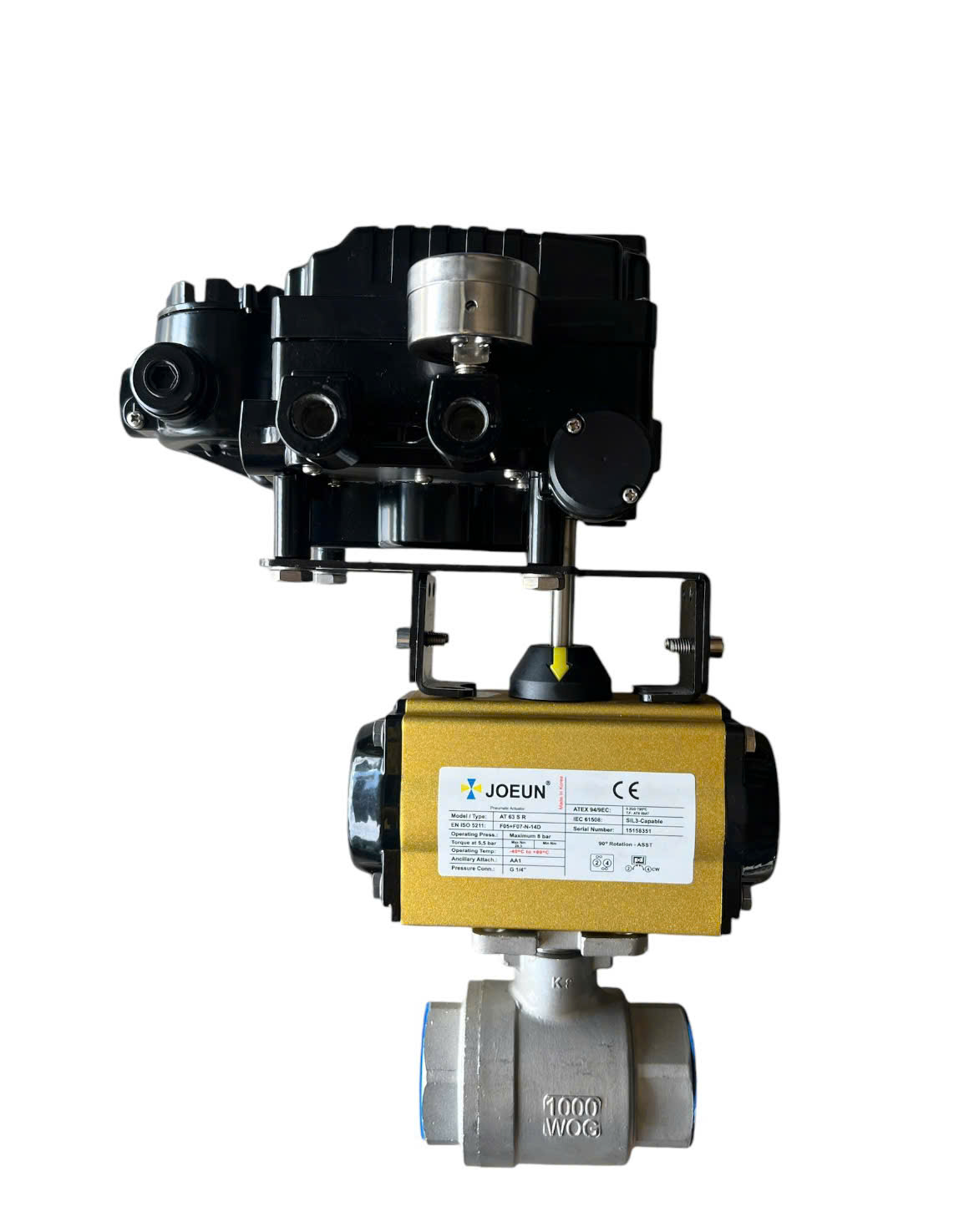 Trên thân van bi còn có trục kết nối dùng để lắp đầu khí nén với quả bi để điều khiển đóng mở và có thêm tán và gá van bi dùng để đỡ đầu điều khiển khí nén van.